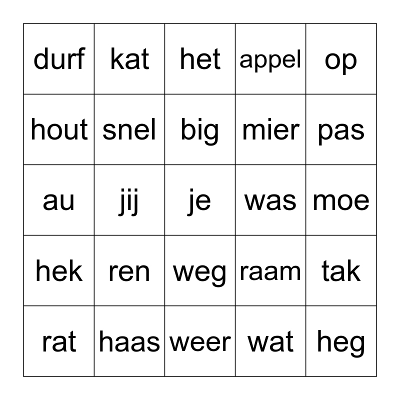 This bingo card has 30 words: haas, zag, jij, ben, durf, het, snel, weg, was, weer, moe, je, wat, heg, pas, kip, raam, hek, ren, op, au, reus, kat, mier, hout, appel, tak, rat, big and dak.