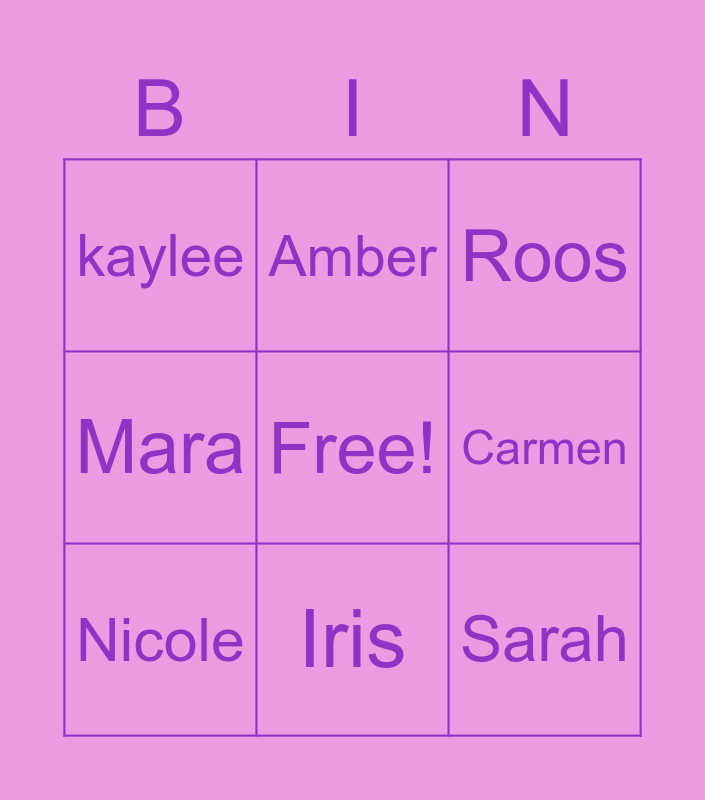 This bingo card has a free space and 8 words: Carmen, Roos, Amber, Nicole, kaylee, Sarah, Mara and Iris.