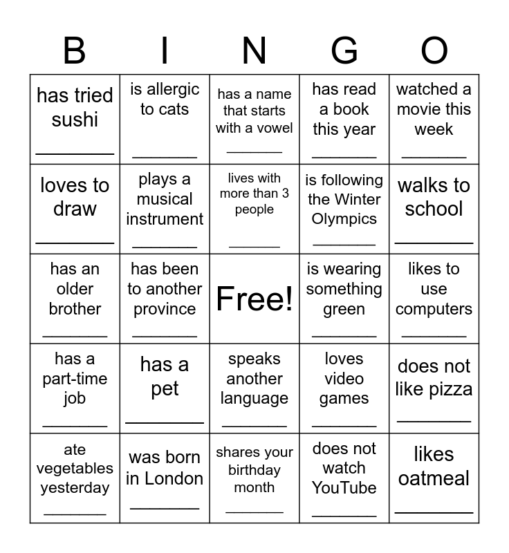 This bingo card has a free space and 24 words: has a pet _______, was born in London _______, lives with more than 3 people _______, ate vegetables yesterday _______, watched a movie this week _______, has tried sushi _______, loves to draw _______, is allergic to cats _______, is wearing something green _______, speaks another language _______, is following the Winter Olympics _______, has an older brother _______, loves video games _______, does not like pizza _______, plays a musical instrument _______, does not watch YouTube _______, likes to use computers _______, has a name that starts with a vowel _______, walks to school _______, has been to another province _______, likes oatmeal _______, has a part-time job _______, has read a book this year _______ and shares your birthday month _______.