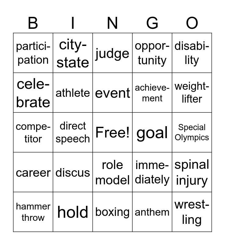 This bingo card has a free space and 48 words: cheer, wrest-ling, take place, boxing, discus, javelin, city-state, wreath, cele-brate, victory, athlete, oppor-tunity, spinal injury, imme-diately, facility, qualify, event, goal, confuse, disabi-lity, direct speech, anthem, partici-pation, achieve-ment, success, weight-lifter, hammer throw, pride, role model, career, issue, decath-lon, respect, train, hold, cong-ress, loser, Special Olympics, Para-lympics, course, spectator, worn out, judge, dust, compe-titor, corn field, beg and thirsty.