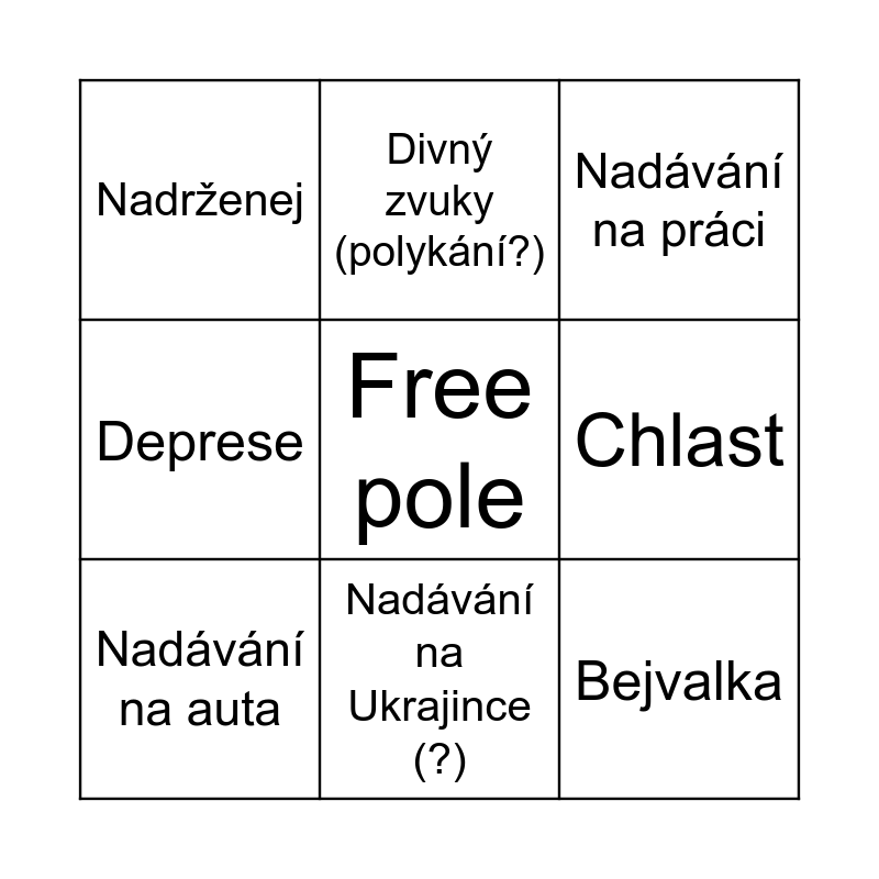 This bingo card has a free space and 8 words: Chlast, Nadávání na práci, Divný zvuky (polykání?), Nadávání na auta, Nadrženej, Bejvalka, Deprese and Nadávání na Ukrajince (?).