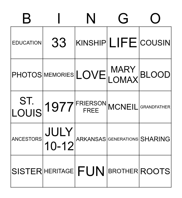 This bingo card has a free space and 24 words: JULY 10-12, HERITAGE, LOVE, SISTER, COUSIN, EDUCATION, PHOTOS, 33, MCNEIL, ARKANSAS, MARY LOMAX, ST. LOUIS, GENERATIONS, SHARING, MEMORIES, BROTHER, GRANDFATHER, KINSHIP, BLOOD, 1977, ROOTS, ANCESTORS, LIFE and FUN.