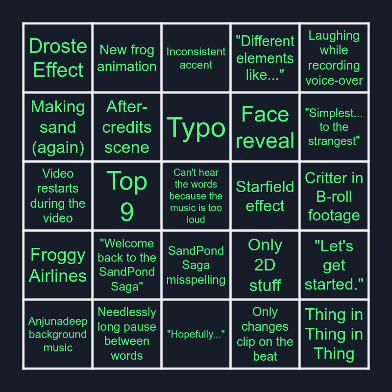 This bingo card has a free space and 24 words: "Welcome back to the SandPond Saga", Needlessly long pause between words, Typo, Anjunadeep background music, Laughing while recording voice-over, Droste Effect, Making sand (again), New frog animation, Starfield effect, SandPond Saga misspelling, Face reveal, Video restarts during the video, Only 2D stuff, "Let's get started.", After-credits scene, Only changes clip on the beat, Critter in B-roll footage, Inconsistent accent, "Simplest... to the strangest", Top 9, Thing in Thing in Thing, Froggy Airlines, "Different elements like..." and "Hopefully...".
