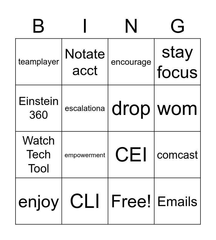 This bingo card has 17 words: Free!, enjoy, encourage, teamplayer, empowerment, stay focus, comcast, drop, wom, escalationa, CLI, CEI, Einstein 360, Notate acct, Watch Tech Tool, ER and Emails.