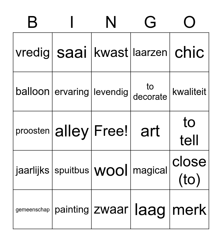 This bingo card has a free space and 29 words: gemeenschap, slopen, alley, noise, vredig, kwast, ervaring, spuitbus, art, painting, to tell, merk, zwaar, laag, kwaliteit, on sale, wool, jaarlijks, chic, proosten, magical, theme, to decorate, balloon, laarzen, saai, close (to), levendig and pollution.