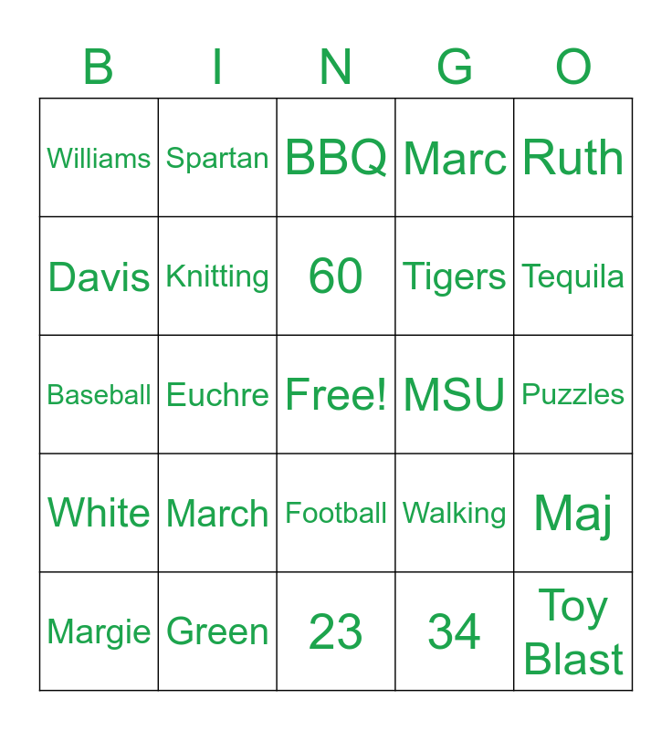 This bingo card has a free space and 25 words: March, 23, 60, Margie, Ruth, Williams, Davis, Spartan, MSU, Football, Tigers, Baseball, Walking, Maj, Knitting, Reading, Puzzles, BBQ, Tequila, Euchre, Toy Blast, Green, White, Marc and 34.