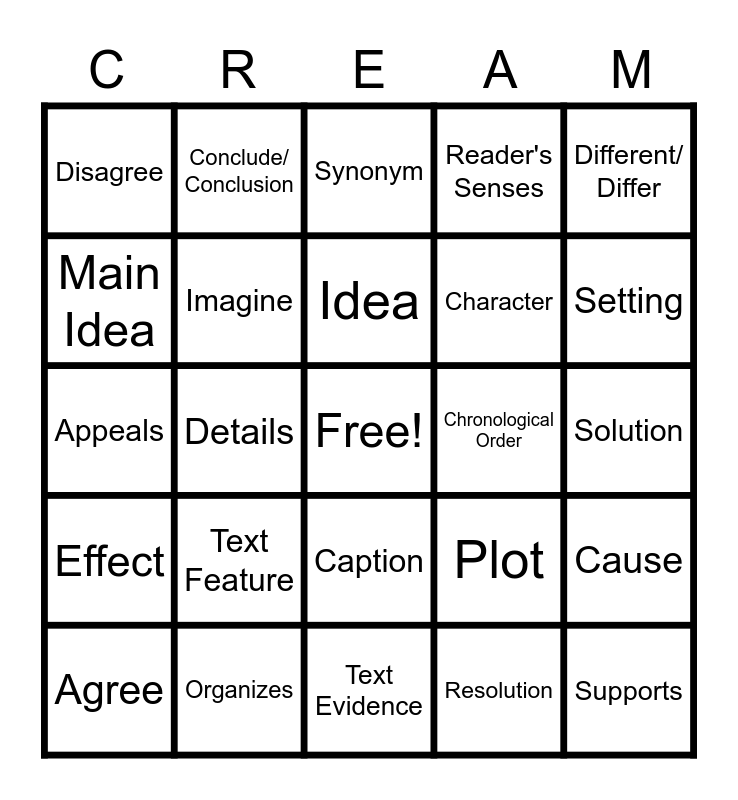 This bingo card has a free space and 76 words: Suffix, Prefix, Synonym, Antonym, Compound Word, Homophone, Paragraph, Section, Message, Selection, Imagery, Suggests, Idea, Main Idea, Lesson, Details, Emphasize, Supports, Included, Different/ Differ, Included, Appeals, Imagine, Conclude/ Conclusion, Reader's Senses, Visulize, Describe, Persuade, Inform, Theme, Author's Purpose, Sensory Language, Summary, Plot, Setting, Character, Problem, Conflict, Solution, Resolution, Climax, Sequence of Events, Diagram, Dialogue, Interaction, Relationship, Agree, Disagree, Events, Photograph, Subheadings, Caption, Dictionary Entry, Boxed Information, Article, Advertisement, Refer, Statement, Chart, Locate, Text Feature, Genre, Fiction, Non-Fiction, Sequence, Text Structure, Chronological Order, Sequence, Compare, Contrast, Cause, Effect, Organizes, Explain, Text Evidence and Infer.