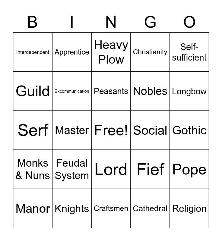 This bingo card has a free space and 24 words: Feudal System, Knights, Peasants, Manor, Self-sufficient, Interdependent, Guild, Apprentice, Social, Lord, Nobles, Serf, Fief, Pope, Excommunication, Cathedral, Gothic, Heavy Plow, Longbow, Master, Religion, Monks & Nuns, Christianity and Craftsmen.