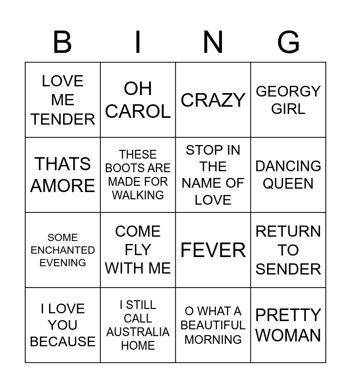 This bingo card has 32 words: JIVE TALKING, VOLARE, RETURN TO SENDER, I GO TO RIO, PRETTY WOMAN, STOP IN THE NAME OF LOVE, THATS AMORE, HOUND DOG, OH CAROL, ITS NOT UNUSUAL, DANCING QUEEN, CRAZY, TENNESSEE WALTZ, PUB WITH NO BEER, I STILL CALL AUSTRALIA HOME, IN THE MOOD, LETS TWIST AGAIN, FEVER, WALTZING MATILDA, AMAZING GRACE, HE'LL HAVE TO GO, ON THE ROAD AGAIN, O WHAT A BEAUTIFUL MORNING, WHITE CHRISTMAS, I LOVE YOU BECAUSE, GEORGY GIRL, SOME ENCHANTED EVENING, THESE BOOTS ARE MADE FOR WALKING, LOVE ME TENDER, ARE YOU LONESOME TONIGHT, EVERYBODY LOVES SOMEBODY and COME FLY WITH ME.