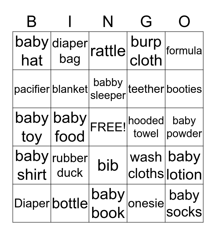 This bingo card has a free space and 24 words: rubber duck, bottle, babby sleeper, Diaper, formula, baby hat, pacifier, diaper bag, hooded towel, bib, teether, baby toy, wash cloths, baby lotion, blanket, onesie, baby powder, rattle, booties, baby food, baby socks, baby shirt, burp cloth and baby book.