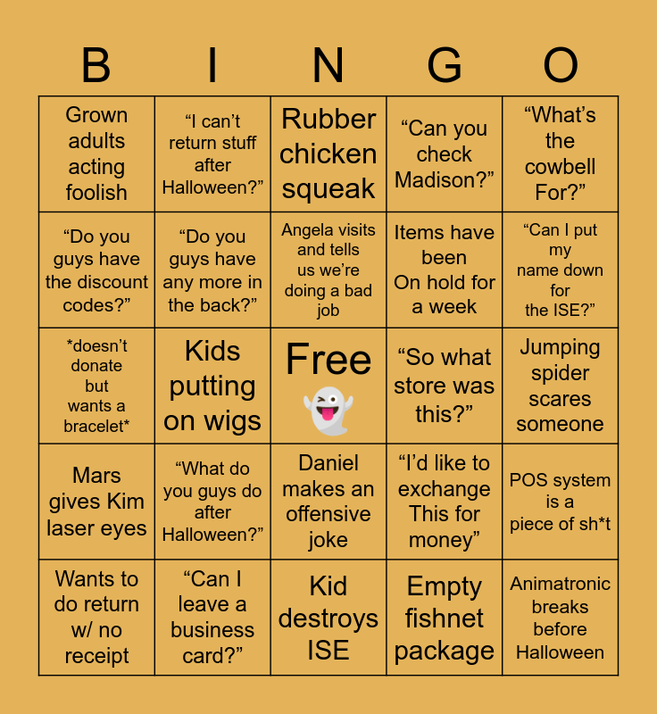 This bingo card has a free space and 29 words: Wants to do return w/ no receipt, Customer tries on costume in aisle, Kids putting on wigs, “No I hate kids I can’t donate”, Grown adults acting foolish, Rubber chicken squeak, “Do you guys have any more in the back?”, “What do you guys do after Halloween?”, “So what store was this?”, “Can I leave a business card?”, Jumping spider scares someone, Animatronic breaks before Halloween, Kid destroys ISE, Empty fishnet package, “Can I put my name down for the ISE?”, Angela yells at us, Daniel makes an offensive joke, Mars gives Kim laser eyes, “What’s the cowbell For?”, *doesn’t donate but wants a bracelet*, “I’d like to exchange This for money”, “Well no one told me that!”, Items have been On hold for a week, “Do you guys have the discount codes?”, “Can you check Madison?”, “I can’t return stuff after Halloween?”, POS system is a piece of sh*t, Angela visits and tells us we’re doing a bad job and People from other stores come in and hate us.