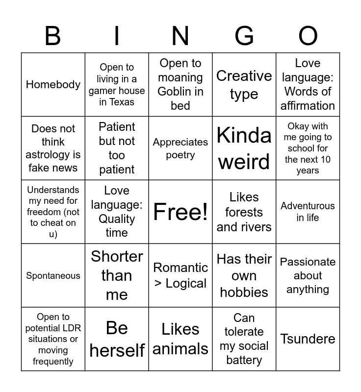 This bingo card has a free space and 24 words: Open to potential LDR situations or moving frequently, Shorter than me, Appreciates poetry, Can tolerate my social battery, Love language: Words of affirmation, Homebody, Open to living in a gamer house in Texas, Open to moaning Goblin in bed, Likes forests and rivers, Adventurous in life, Understands my need for freedom (not to cheat on u), Patient but not too patient, Has their own hobbies, Passionate about anything, Does not think astrology is fake news, Be herself, Likes animals, Creative type, Okay with me going to school for the next 10 years, Spontaneous, Love language: Quality time, Romantic > Logical, Kinda weird and Tsundere.