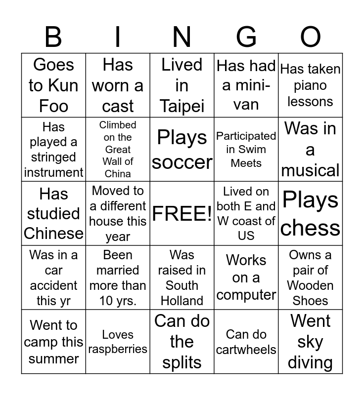 This bingo card has a free space and 24 words: Been married more than 10 yrs., Loves raspberries, Plays soccer, Went to camp this summer, Has taken piano lessons, Goes to Kun Foo, Has played a stringed instrument, Has worn a cast, Lived on both E and W coast of US, Was raised in South Holland, Participated in Swim Meets, Has studied Chinese, Works on a computer, Owns a pair of Wooden Shoes, Climbed on the Great Wall of China, Can do cartwheels, Plays chess, Lived in Taipei, Was in a musical, Moved to a different house this year, Went sky diving, Was in a car accident this yr, Has had a mini-van and Can do the splits.