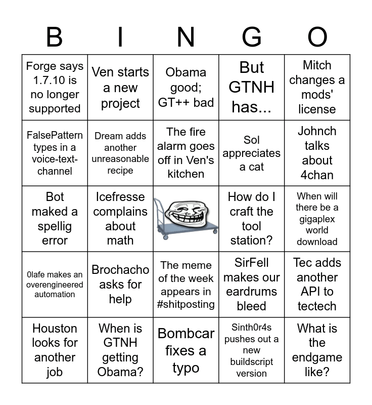 This bingo card has a free space and 24 words: Brochacho asks for help, When is GTNH getting Obama?, The fire alarm goes off in Ven's kitchen, Houston looks for another job, Mitch changes a mods' license, Forge says 1.7.10 is no longer supported, FalsePattern types in a voice-text-channel, Ven starts a new project, How do I craft the tool station?, The meme of the week appears in #shitposting, Sol appreciates a cat, Bot maked a spellig error, SirFell makes our eardrums bleed, Tec adds another API to tectech, Dream adds another unreasonable recipe, Sinth0r4s pushes out a new buildscript version, When will there be a gigaplex world download, Obama good; GT++ bad, Johnch talks about 4chan, Icefresse complains about math, What is the endgame like?, 0lafe makes an overengineered automation, But GTNH has... and Bombcar fixes a typo.