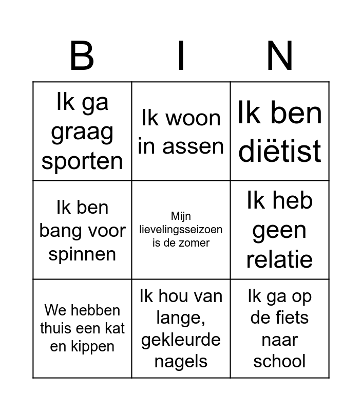 This bingo card has 21 words: Free!, Ik ben 25 jaar, Ik woon in assen, Ik heb een zus en twee broertjes, Mijn lievelingskleur is roze, We hebben thuis een kat en kippen, Ik ga graag sporten, Ik ben diëtist, Ik ben gek op schoenen, Ik hou van lange, gekleurde nagels, Ik ga op de fiets naar school, Ik ben bang voor spinnen, Mijn lievelingsdier is een kat, Ik ben jarig in november, Ik heb geen relatie, Ik ben gek op grapjes, Ik woon samen met mijn vader en twee broertjes, Ik kijk graag series op Netflix, Mijn lievelingsseizoen is de zomer, Ik ben gek op taart and Ik drink graag thee.