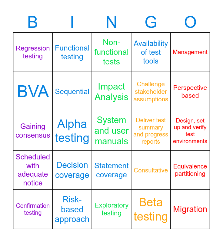 This bingo card has a free space and 29 words: Component testing, Risk-based approach, Non-functional tests, Facilitator, Management, Regression testing, Sequential, Impact Analysis, Deliver test summary and progress reports, Equivalence partitioning, Confirmation testing, Alpha testing, Beta testing, Migration, Gaining consensus, Methodical, Exploratory testing, Consultative, Perspective based, Scheduled with adequate notice, Decision coverage, Incremental, Challenge stakeholder assumptions, Design, set up and verify test environments, BVA, Functional testing, Statement coverage, Availability of test tools and estimated remaining defects are low.