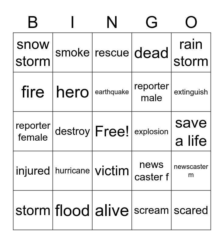 This bingo card has a free space and 24 words: hurricane, flood, earthquake, storm, rain storm, snow storm, fire, smoke, explosion, victim, reporter male, reporter female, news caster f, newscaster m, hero, scream, save a life, rescue, extinguish, destroy, scared, injured, dead and alive.