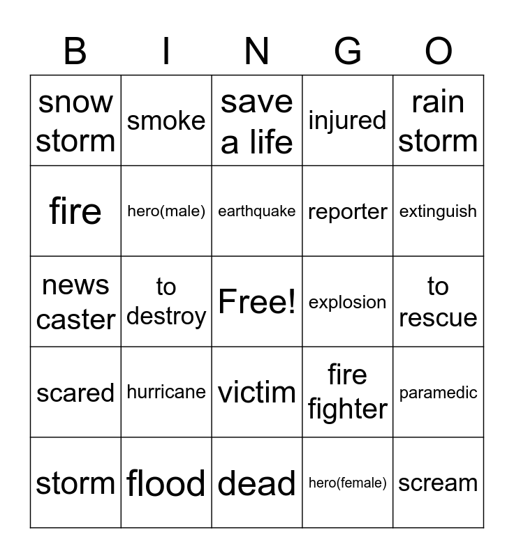 This bingo card has a free space and 24 words: hurricane, flood, earthquake, storm, rain storm, snow storm, fire, smoke, explosion, victim, reporter, news caster, fire fighter, paramedic, hero(male), hero(female), to rescue, save a life, extinguish, to destroy, scream, scared, injured and dead.
