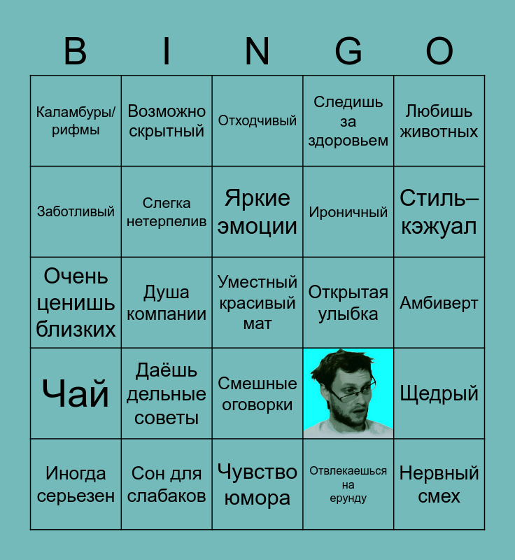 This bingo card has 1 images and 24 words: Даёшь дельные советы, Чувство юмора, Яркие эмоции, Иногда серьезен, Любишь животных, Каламбуры/рифмы, Заботливый, Возможно скрытный, Открытая улыбка, Смешные оговорки, Ироничный, Очень ценишь близких, Щедрый, Слегка нетерпелив, Нервный смех, Амбиверт, Отходчивый, Стиль–кэжуал, Душа компании, Уместный красивый мат, Сон для слабаков, Чай, Следишь за здоровьем and Отвлекаешься на ерунду.