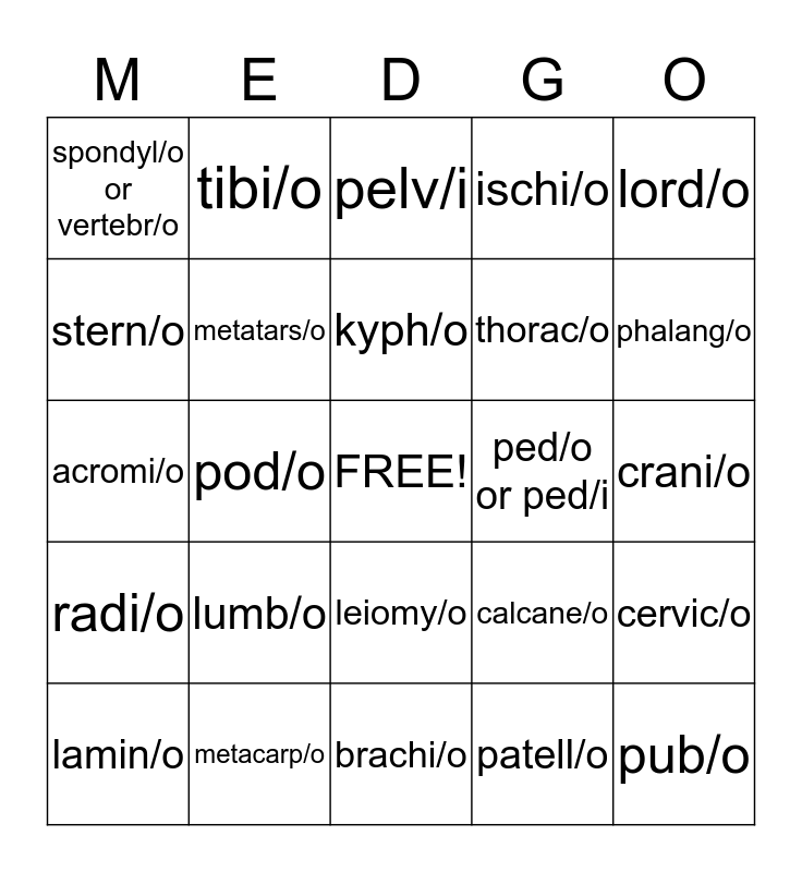 This bingo card has a free space and 24 words: lumb/o, metacarp/o, kyph/o, lamin/o, lord/o, spondyl/o or vertebr/o, stern/o, tibi/o, ped/o or ped/i, leiomy/o, thorac/o, acromi/o, calcane/o, cervic/o, metatars/o, patell/o, crani/o, pelv/i, phalang/o, pod/o, pub/o, radi/o, ischi/o and brachi/o.