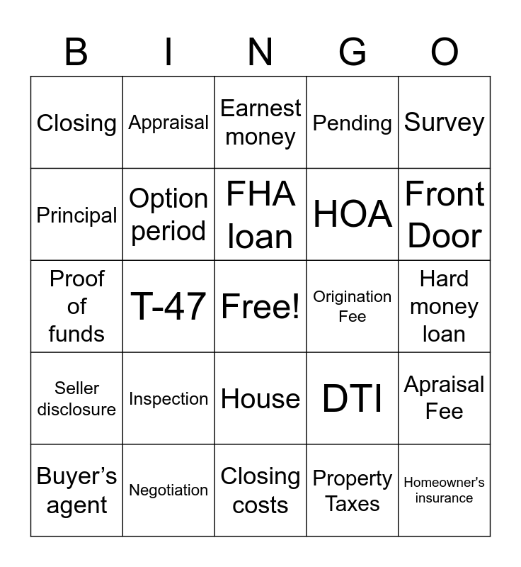 This bingo card has a free space and 55 words: As-is, Buyer’s agent, Listing Agent, Closing, Closing costs, DOM, Option period, Escrow, HOA, MLS, Pending, REALTOR, Leaseback, Active option, SOLD, Closing Disclosure, Survey, T-47, Open House, Homeowner's insurance, Origination Fee, PMI, DTI, Earnest money, Equity, FHA loan, Property Taxes, Fixed rate mortgage, Hard money loan, Apraisal Fee, Pre-approval, Loan Estimate, Pre-qualification, Keys, Principal, Proof of funds, Contract, Seller disclosure, PITI, VA loan, Appraisal, Backup offer, DPA Loan, Contingency, Inspection, Negotiation, Option fee, Seller concession, Title Insurance, Front Door, Showing, Walk Thru, Home Warranty, House and Real Estate.
