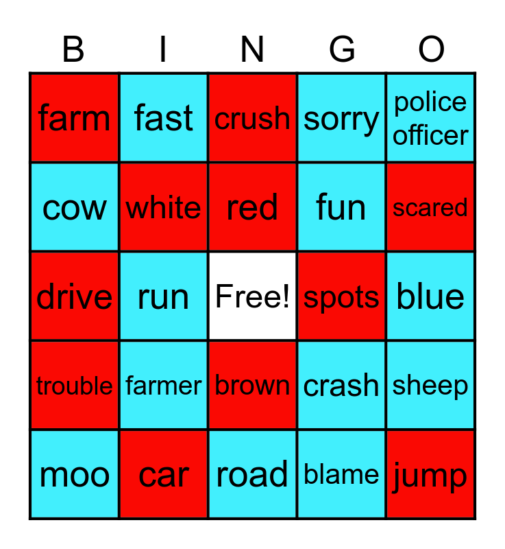 This bingo card has a free space and 24 words: farmer, car, red, moo, police officer, farm, cow, fast, spots, brown, fun, drive, crash, sheep, white, blame, blue, crush, scared, run, jump, trouble, sorry and road.