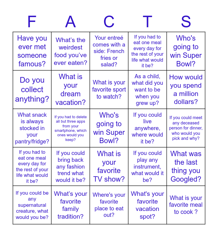 This bingo card has a free space and 64 words: Coffee or tea?, What is your most used emoji?, You have to sing karaoke, what song do you pick?, What's your favorite vacation spot?, What is your favorite season?, What is your favorite season?, What’s the weirdest food you’ve ever eaten?, What are you reading right now?, If you could live anywhere, where would it be?, What’s your favorite breakfast cereal?, If you had to eat one meal every day for the rest of your life what would it be?, What is your favorite holiday?, If you could play any instrument, what would it be?, Who's going to win Super Bowl?, Coffee or tea?, What is your dream vacation?, What is your favorite sport to watch?, If you had to eat one meal every day for the rest of your life what would it be?, Ever broken a bone?, Do you collect anything?, What’s your favorite family tradition?, What is your favorite TV show?, As a child, what did you want to be when you grew up?, What is your favorite meal to cook ?, Do you play any instruments?, Early bird or night owl?, Which song can you listen to all day long?, If you could be on a reality TV show, which one would you choose and why?, If you could meet any deceased person for dinner, who would you pick and why?, If you could be any supernatural creature, what would you be?, What sport would you compete in if you were in the Olympics?, Can you speak another language?, If you could instantly become an expert in something, what would it be?, If you had to play one album forever which one would it be?, What snack is always stocked in your pantry/fridge?, You have your own late night talk show, who do you invite as your first guest?, If you could meet any living person for dinner, who would you pick and why?, If you could magically become fluent in any language, what would it be?, What superpower do you wish you possessed?, Have you ever met someone famous?, If you had to delete all but three apps from your smartphone, which ones would you keep?, Where's your favorite place to eat out?, If you could hang out with any cartoon character, who would you choose and why?, Which actor would you want to play you in the movie about your life?, What's your go-to dessert?, If you could bring back any fashion trend what would it be?, If you could kill any fashion trend forever what would it be?, What's the best show/concert you've been to?, How would you spend a million dollars?, What's your drink of choice?, What was your very first job?, If you could change places with anyone in the world, who would it be and why?, What's your favorite store to shop at (online or not), What was the last thing you Googled?, Did you play any sports growing up?, What's the best advice you've ever heard?, Your entreé comes with a side: French fries or salad?, What's the longest you've traveled to get to a destination?, What topic could you give a 20-minute presentation on without any preparation?, Got any cool scars?, What was your favorite toy when you were kid?, What website or app doesn’t exist, but you really wish it did?, What was your favorite subject in school? and Got any guilty pleasures?.