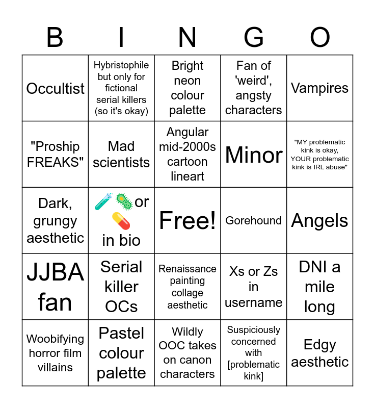 This bingo card has a free space and 33 words: Crustpunk deer, dog, opossum or rat, π₯π©Έorπ in bio, π§ͺπ¦ orπ in bio, βπͺor πͺ in bio, JJBA fan, Mad scientists, Vampires, Woobifying horror film villains, Hybristophile but only for fictional serial killers (so it's okay), True crime fan, Angular mid-2000s cartoon lineart, Bright neon colour palette, Furry with lots of tattoos and/or piercings, "Gutterpunk" but lives with parents, Gorehound, "MY problematic kink is okay, YOUR problematic kink is IRL abuse", Pastel colour palette, Dark, grungy aesthetic, Serial killer OCs, Xs or Zs in username, Renaissance painting collage aesthetic, Slasher fan, Occultist, Angels, Wildly OOC takes on canon characters, Edgy aesthetic, Fan of 'weird', angsty characters, Minor, "Proship FREAKS", DNI a mile long, "ACAB" "I'm calling the police on this proshipper", Suspiciously concerned with [problematic kink] and "All anime & manga is pedo".