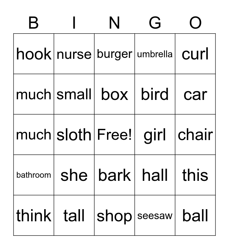 This bingo card has a free space and 29 words: think, moon, sloth, church, hook, burger, small, she, girl, tall, chair, ball, shop, seesaw, car, mesh, bark, bathroom, curl, much, hall, tree, bird, much, umbrella, nurse, this, box and sofa.