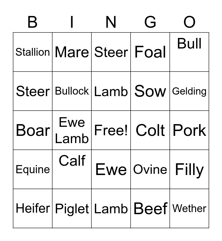 This bingo card has a free space and 24 words: Calf, Piglet, Lamb, Heifer, Bull, Stallion, Steer, Mare, Colt, Ewe, Sow, Boar, Ovine, Filly, Bullock, Beef, Pork, Steer, Gelding, Ewe Lamb, Wether, Equine, Foal and Lamb.