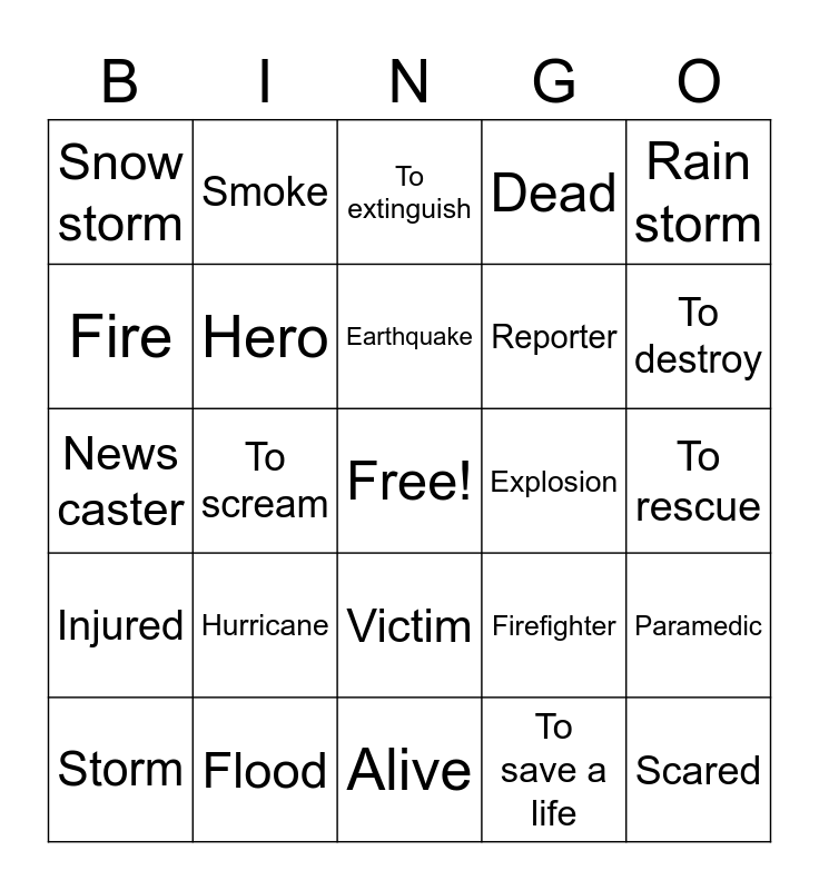 This bingo card has a free space and 24 words: Hurricane, Flood, Earthquake, Storm, Rain storm, Snow storm, Fire, Smoke, Explosion, Victim, Reporter, News caster, Firefighter, Paramedic, Hero, To save a life, To rescue, To extinguish, To destroy, To scream, Scared, Injured, Dead and Alive.