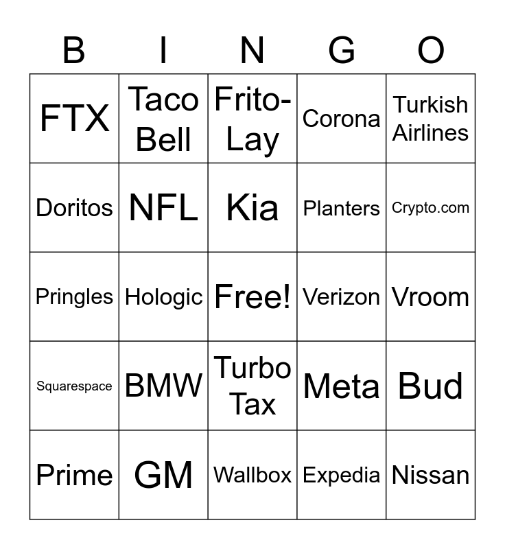 This bingo card has a free space and 24 words: BMW, GM, Kia, Prime, Turkish Airlines, FTX, Doritos, Taco Bell, Verizon, Turbo Tax, Planters, Pringles, Meta, Bud, NFL, Expedia, Vroom, Frito-Lay, Crypto.com, Hologic, Nissan, Squarespace, Corona and Wallbox.