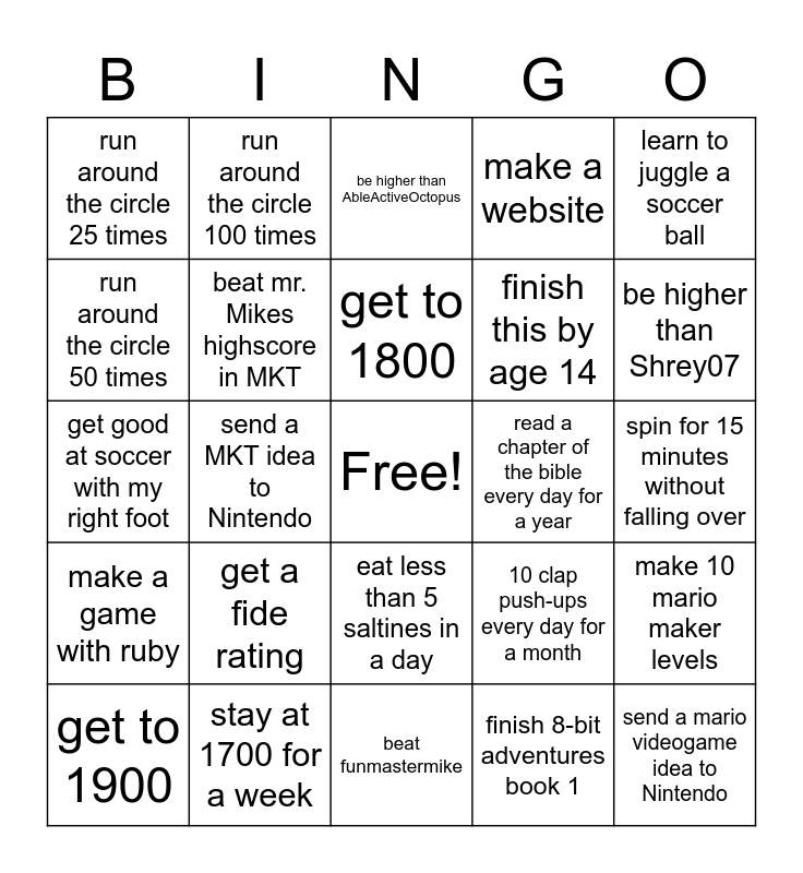 This bingo card has a free space and 24 words: get a fide rating, stay at 1700 for a week, get to 1800, get to 1900, learn to juggle a soccer ball, run around the circle 25 times, run around the circle 50 times, run around the circle 100 times, read a chapter of the bible every day for a year, eat less than 5 saltines in a day, finish this by age 14, get good at soccer with my right foot, 10 clap push-ups every day for a month, make 10 mario maker levels, beat mr. Mikes highscore in MKT, finish 8-bit adventures book 1, spin for 15 minutes without falling over, be higher than AbleActiveOctopus, be higher than Shrey07, send a MKT idea to Nintendo, send a mario videogame idea to Nintendo, make a game with ruby, make a website and beat funmastermike.