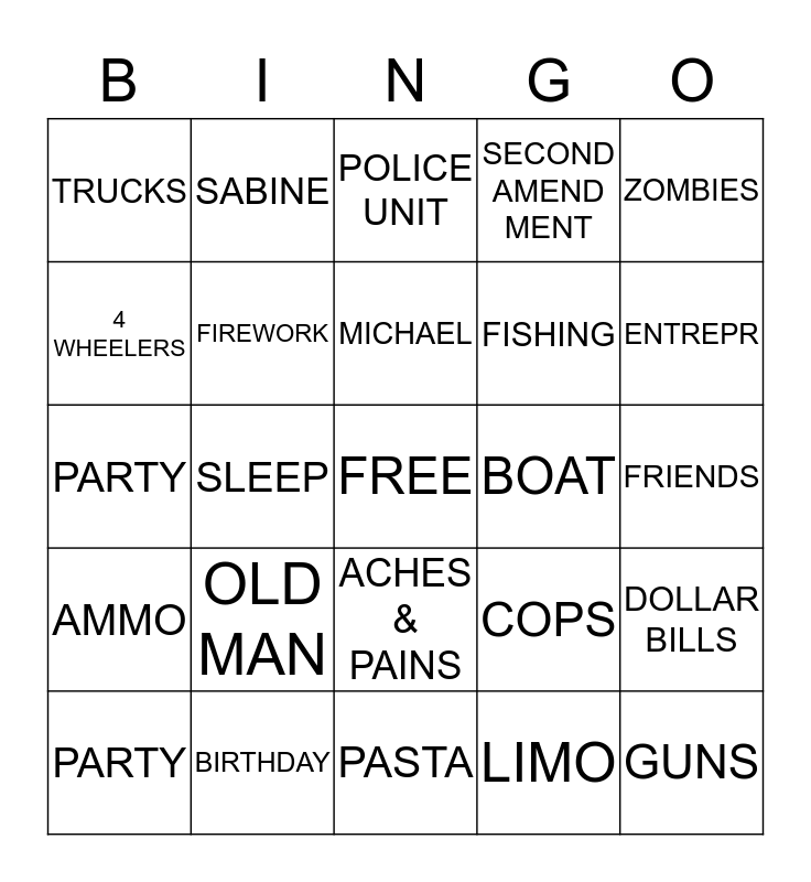 This bingo card has a free space and 24 words: OLD MAN, BIRTHDAY, MICHAEL, PARTY, ZOMBIES, TRUCKS, 4 WHEELERS, SABINE, BOAT, ACHES & PAINS, FISHING, PARTY, COPS, DOLLAR BILLS, FIREWORK, LIMO, FRIENDS, POLICE UNIT, ENTREPR, SLEEP, GUNS, AMMO, SECOND AMEND MENT and PASTA.
