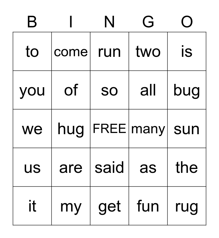 This bingo card has a free space and 24 words: are, my, so, it, is, to, you, come, many, said, all, we, as, the, of, fun, sun, run, bug, hug, rug, us, two and get.