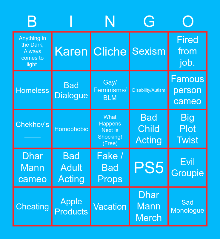 This bingo card has a free space and 39 words: So You See... / You See.., Crime, Racism, Bad Dialogue, Cheating, Fake / Bad Props, Gay/ Feminisms/ BLM, Parking Lot Confrontation, Fired from job., Dhar Mann cameo, Homophobic, Sexism, Sad Monologue, Big Plot Twist, Bad Child Acting, Bad Adult Acting, Cartoon Super Villian, Anything in the Dark, Always comes to light., Old People Judge Young, PS5, Homeless, Vacation, Disability/Autism, Famous person cameo, Rich and Spoiled Kids, Hungry, Oblivious, Roasted, Apology That's NOT Deserved, Karen, Sketchy Character, Social Media mention, Cliche, Apple Products, Dhar Mann Merch, Dhar Car, Evil Groupie, Chekhov's ____ and Instrument.
