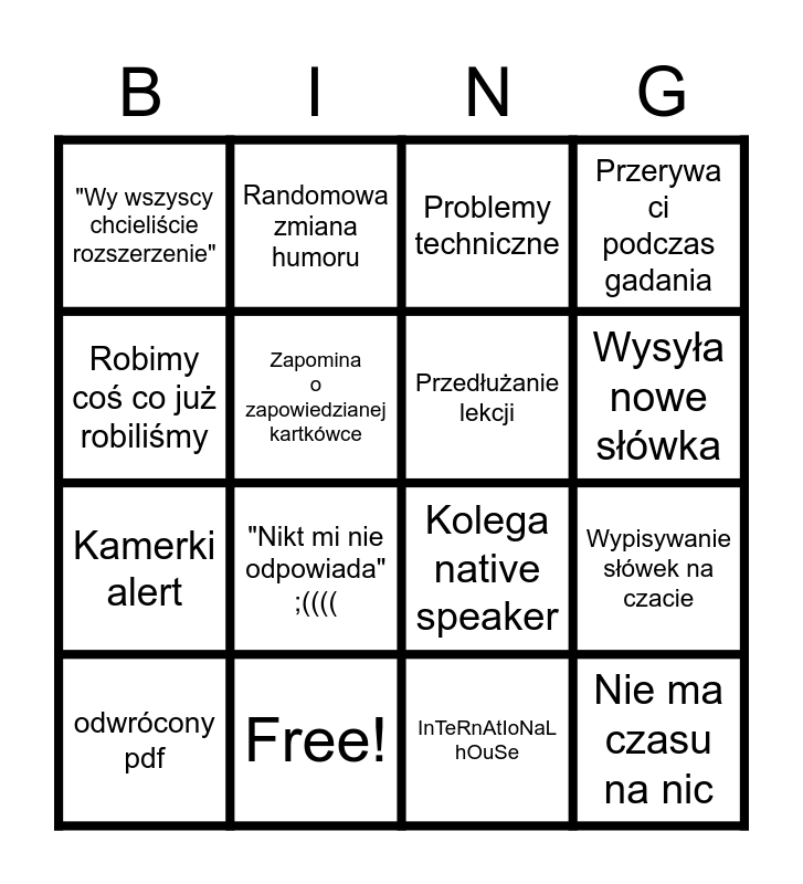 This bingo card has 27 words: EXTENDED MATURA EXAMINATION, Żarczyński triggered, Kamerki alert, Zapomina o ustalonym zadaniu, Zapomina o zapowiedzianej kartkówce, Problemy techniczne, Randomowa zmiana humoru, Nie ma czasu na nic, Free!, "Jak chcecie to możemy odpuścić", Kolega native speaker, Przerywa ci podczas gadania, Oj ktoś nie słuchał, Gadanie o głupich słówkach z listy, "Nikt mi nie odpowiada" ;((((, "Ja to wam muszę pokazać, bo nie będę mogła spać", Przedłużanie lekcji, Wysyła nowe słówka, "Czy na meecie możecie mi wysyłać, żebym tylko ja widziała?", "Wy wszyscy chcieliście rozszerzenie", InTeRnAtIoNaL hOuSe, Prezentuje plany na 40 następnych lekcji, Wypisywanie słówek na czacie, odwrócony pdf, "Ten podręcznik to taki słaby", Robimy coś co już robiliśmy and czoło cam.
