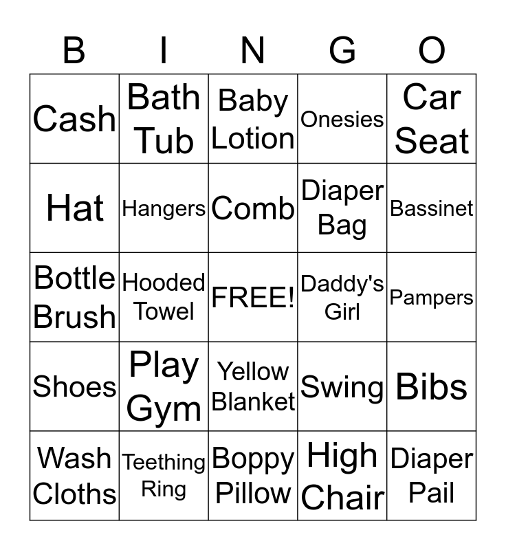 This bingo card has a free space and 24 words: Play Gym, Teething Ring, Comb, Wash Cloths, Car Seat, Cash, Hat, Bath Tub, Daddy's Girl, Yellow Blanket, Diaper Bag, Bottle Brush, Swing, Bibs, Hangers, High Chair, Pampers, Baby Lotion, Bassinet, Hooded Towel, Diaper Pail, Shoes, Onesies and Boppy Pillow.