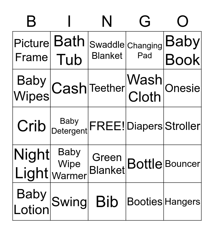 This bingo card has a free space and 24 words: Baby Wipe Warmer, Swing, Teether, Baby Lotion, Baby Book, Picture Frame, Baby Wipes, Bath Tub, Diapers, Green Blanket, Wash Cloth, Crib, Bottle, Bouncer, Cash, Booties, Stroller, Swaddle Blanket, Onesie, Baby Detergent, Hangers, Night Light, Changing Pad and Bib.