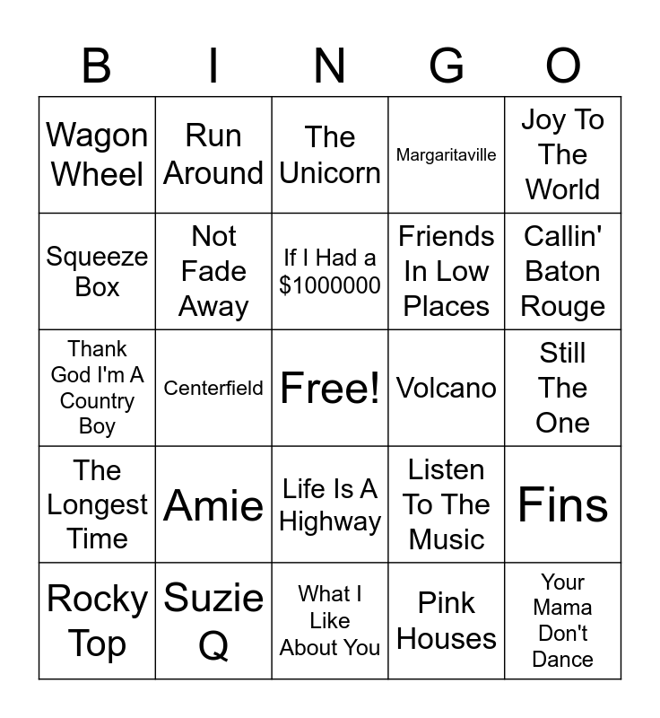 This bingo card has a free space and 41 words: Take Me Home Country Roads, Thank God I'm A Country Boy, Sweet Carloine, Not Fade Away, Suzie Q, Life Is A Highway, If I Had a $1000000, Bad Bad Leroy Brown, Joy To The World, The Longest Time, Centerfield, Margaritaville, Your Mama Don't Dance, Still The One, Volcano, Amie, 867-5309/Jenny, Wagon Wheel, Small Town, The Unicorn, Fins, Dirty Water, What I Like About You, Friends In Low Places, It's Five O'Clock Somewhere, Jet Airliner, Pink Houses, Drift Away, Callin' Baton Rouge, Already Gone, Ants Marching, Run Around, Rocky Top, Heartache Tonight, Listen To The Music, Squeeze Box, But It's Alright, Secret Agent Man, Keeping The Faith, Something To Talk About and Bop.