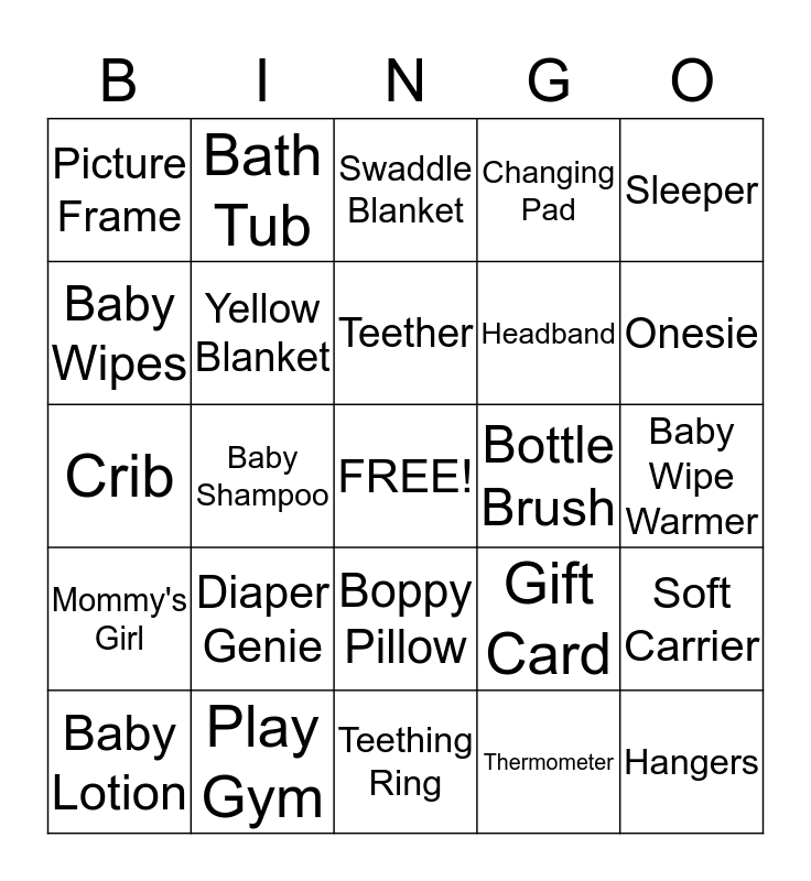 This bingo card has a free space and 24 words: Diaper Genie, Play Gym, Teether, Baby Lotion, Sleeper, Picture Frame, Baby Wipes, Bath Tub, Bottle Brush, Boppy Pillow, Headband, Crib, Gift Card, Soft Carrier, Yellow Blanket, Thermometer, Baby Wipe Warmer, Swaddle Blanket, Onesie, Baby Shampoo, Hangers, Mommy's Girl, Changing Pad and Teething Ring.