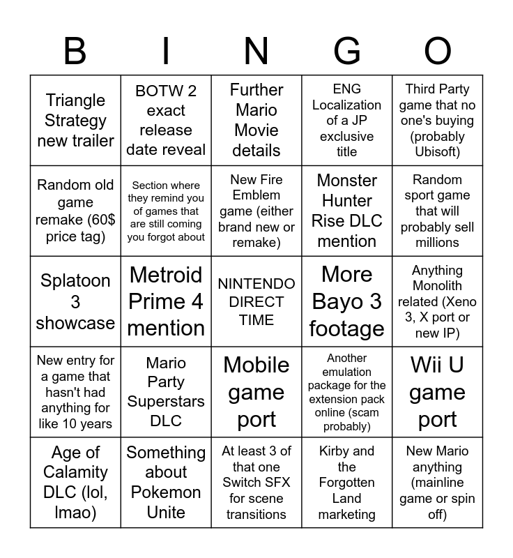 This bingo card has a free space and 24 words: Mario Party Superstars DLC, Something about Pokemon Unite, New Fire Emblem game (either brand new or remake), Age of Calamity DLC (lol, lmao), Third Party game that no one's buying (probably Ubisoft), Triangle Strategy new trailer, Random old game remake (60$ price tag), BOTW 2 exact release date reveal, More Bayo 3 footage, Mobile game port, Monster Hunter Rise DLC mention, Splatoon 3 showcase, Another emulation package for the extension pack online (scam probably), Wii U game port, Section where they remind you of games that are still coming you forgot about, Kirby and the Forgotten Land marketing, Anything Monolith related (Xeno 3, X port or new IP), Further Mario Movie details, Random sport game that will probably sell millions, Metroid Prime 4 mention, New Mario anything (mainline game or spin off), New entry for a game that hasn't had anything for like 10 years, ENG Localization of a JP exclusive title and At least 3 of that one Switch SFX for scene transitions.