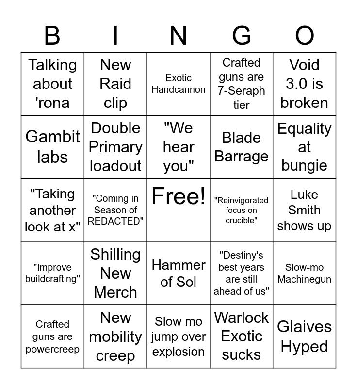 This bingo card has a free space and 24 words: Shilling New Merch, New mobility creep, "We hear you", Crafted guns are powercreep, Void 3.0 is broken, Talking about 'rona, Gambit labs, New Raid clip, "Reinvigorated focus on crucible", Hammer of Sol, Blade Barrage, "Taking another look at x", "Destiny's best years are still ahead of us", Slow-mo Machinegun, Double Primary loadout, Warlock Exotic sucks, Luke Smith shows up, Exotic Handcannon, Equality at bungie, "Coming in Season of REDACTED", Glaives Hyped, "Improve buildcrafting", Crafted guns are 7-Seraph tier and Slow mo jump over explosion.
