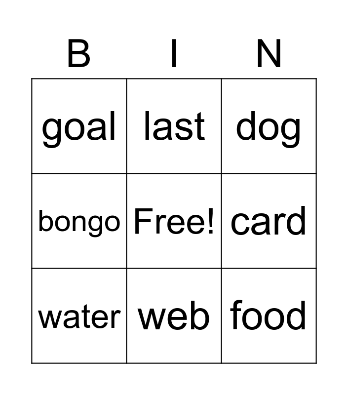This bingo card has a free space and 9 words: water, dog, last, bongo, goal, card, food, eco and web.