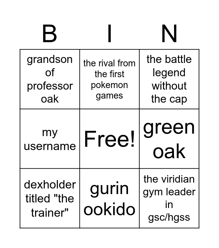 This bingo card has a free space and 8 words: green oak, the battle legend without the cap, the rival from the first pokemon games, dexholder titled "the trainer", grandson of professor oak, the viridian gym leader in gsc/hgss, my username and gurin ookido.