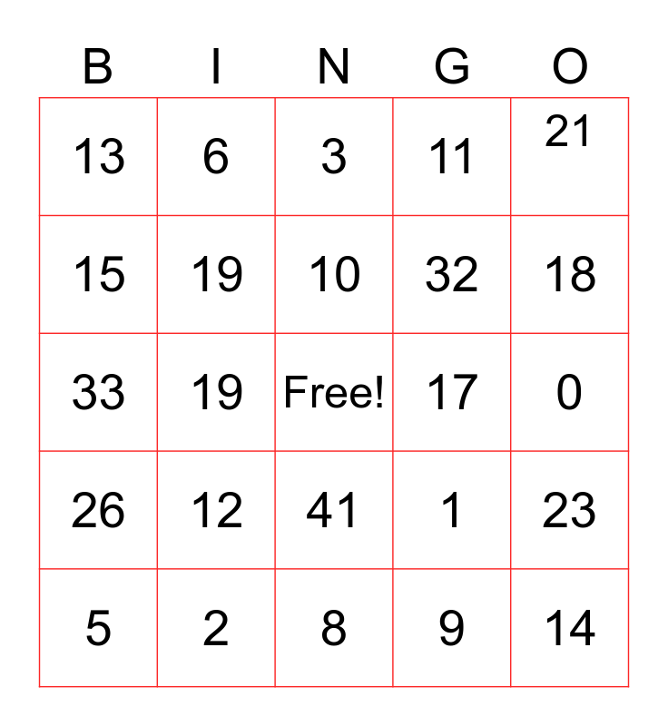 This bingo card has a free space and 24 words: 5, 12, 10, 9, 21, 13, 6, 3, 17, 0, 33, 19, 1, 23, 15, 2, 8, 11, 18, 26, 19, 41, 32 and 14.