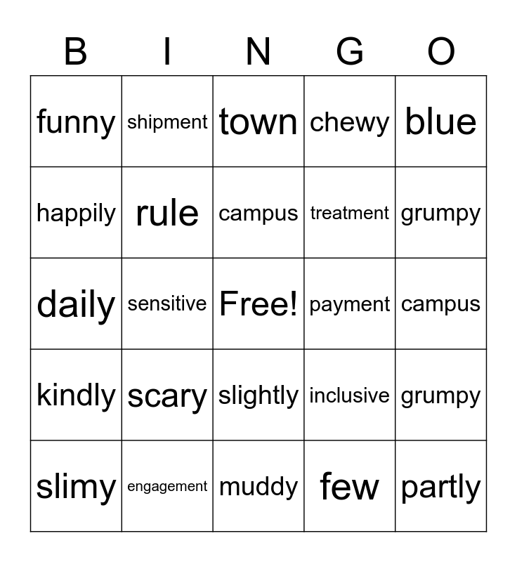 This bingo card has a free space and 24 words: scary, engagement, campus, slimy, blue, funny, happily, shipment, payment, slightly, treatment, daily, inclusive, grumpy, rule, few, campus, town, grumpy, sensitive, partly, kindly, chewy and muddy.