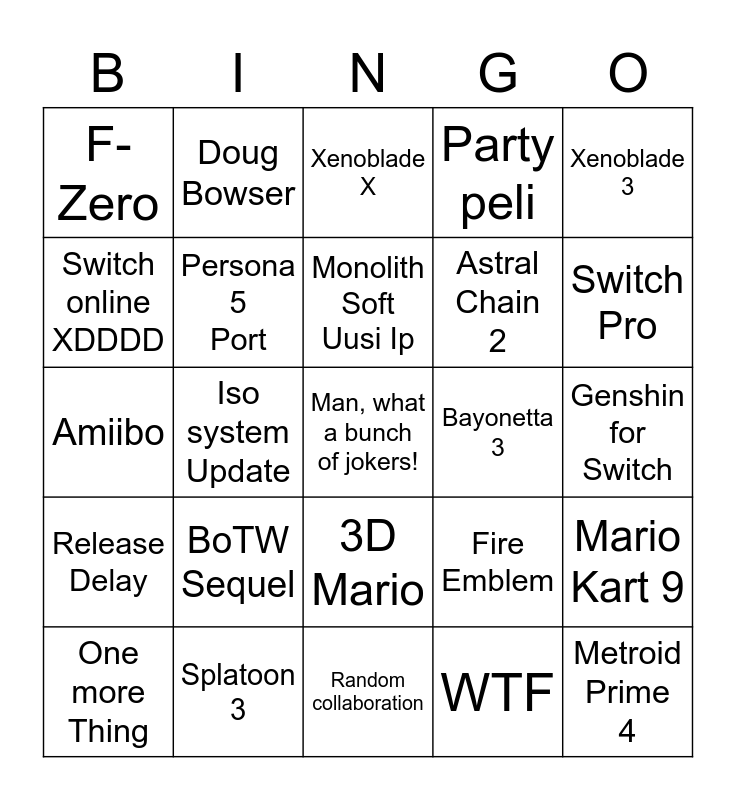This bingo card has a free space and 24 words: BoTW Sequel, Splatoon 3, Monolith Soft Uusi Ip, One more Thing, Xenoblade 3, F-Zero, Switch online XDDDD, Doug Bowser, Bayonetta 3, 3D Mario, Astral Chain 2, Amiibo, Fire Emblem, Mario Kart 9, Persona 5 Port, WTF, Genshin for Switch, Xenoblade X, Switch Pro, Iso system Update, Metroid Prime 4, Release Delay, Party peli and Random collaboration.