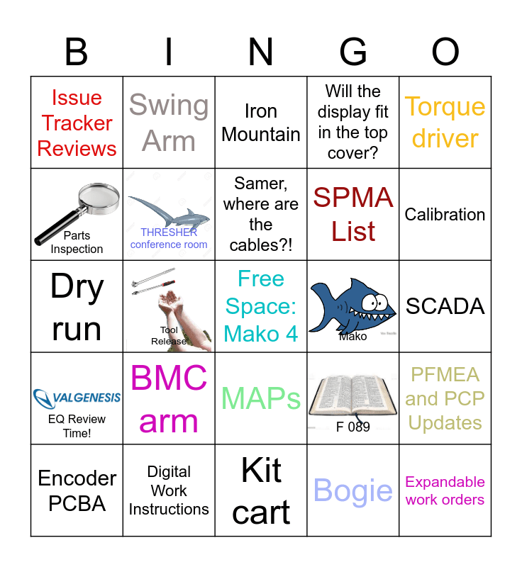 This bingo card has 9 images, a free space and 34 words: Cinderella, Bogie, Elsa, Actuator, EQ Review Time!, THRESHER conference room, Torque driver, Encoder PCBA, Swing Arm, Easy arm, Samer, where are the cables?!, Iron Mountain, Transport Cart, Koops, Mako, Calibration, Digital Work Instructions, Dry run, BMC arm, F 089, MAPs, Tool bit nest, Issue Tracker Reviews, SCADA, Kit cart, Expandable work orders, Will the display fit in the top cover?, Zero batch builds, SPMA List, Parts Inspection, Process Freeze, Tool Release, PFMEA and PCP Updates and Time Study.