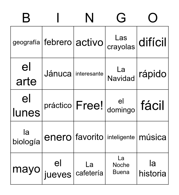 This bingo card has a free space and 24 words: enero, el jueves, interesante, mayo, difícil, geografía, el arte, febrero, el domingo, favorito, La Navidad, el lunes, inteligente, música, Jánuca, La Noche Buena, fácil, activo, rápido, práctico, la historia, la biología, Las crayolas and La cafetería.